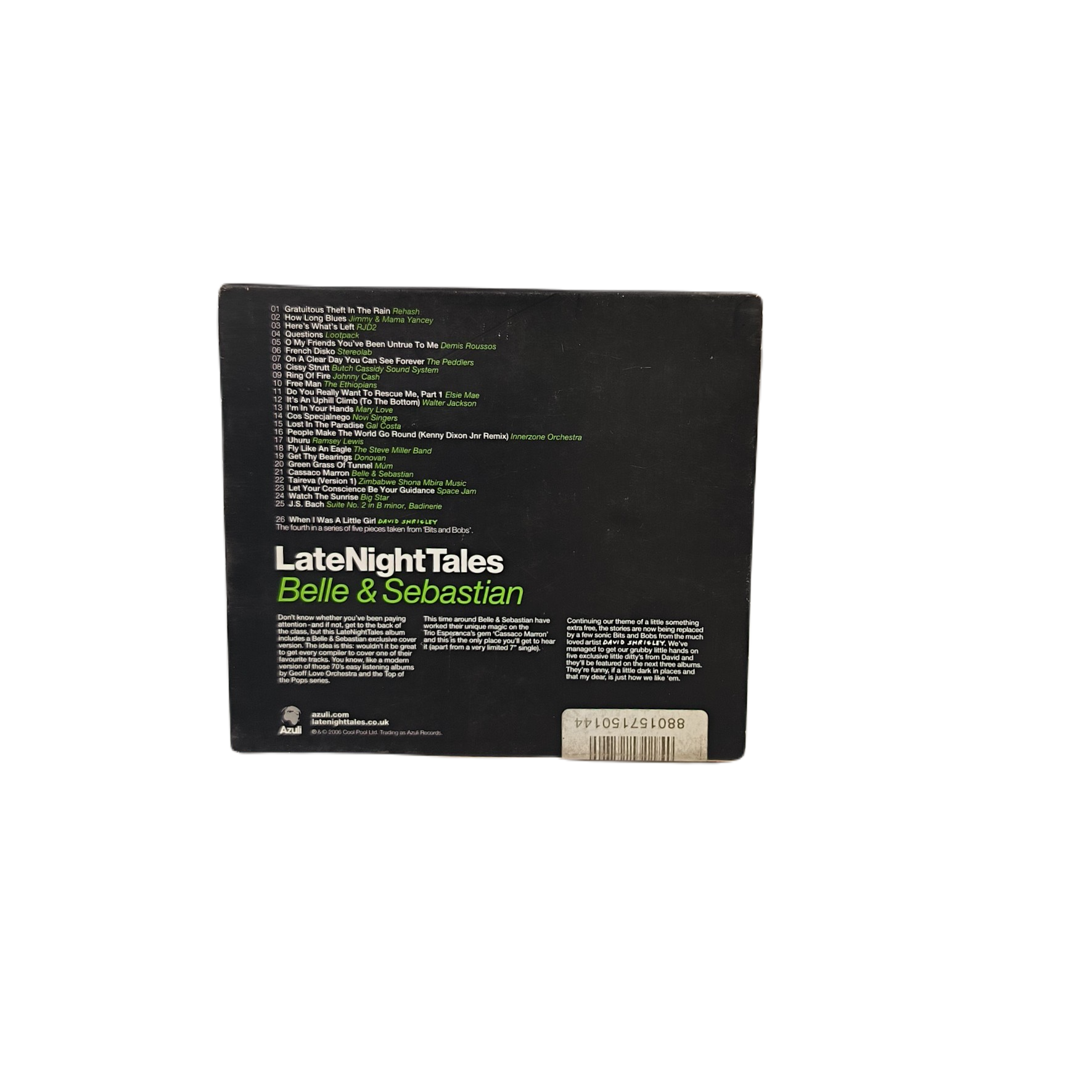 Belle & Sebastian – LateNightTales to album z serii LateNightTales, wydany w 2006 roku na nośniku CD. Muzyka grupy Belle & Sebastian przenosi słuchaczy w świat elektronicznych brzmień, które doskonale nadają się na wieczorne odsłuchy. Stan płyty jest oceniany na 4, co oznacza, że pomimo obecności rys czy otarć, nie wpływają one znacząco na komfortowe odtwarzanie muzyki. Zachwycające utwory zawarte na tym albumie stanowią prawdziwą ucztę dla miłośników muzyki elektronicznej. Buja się w nich delikatne brzmienie z charakterystycznym akcentem Belle & Sebastian. Bułatujące uniesienia dźwięków przenoszą słuchaczy w zmysłowy świat LateNightTales.