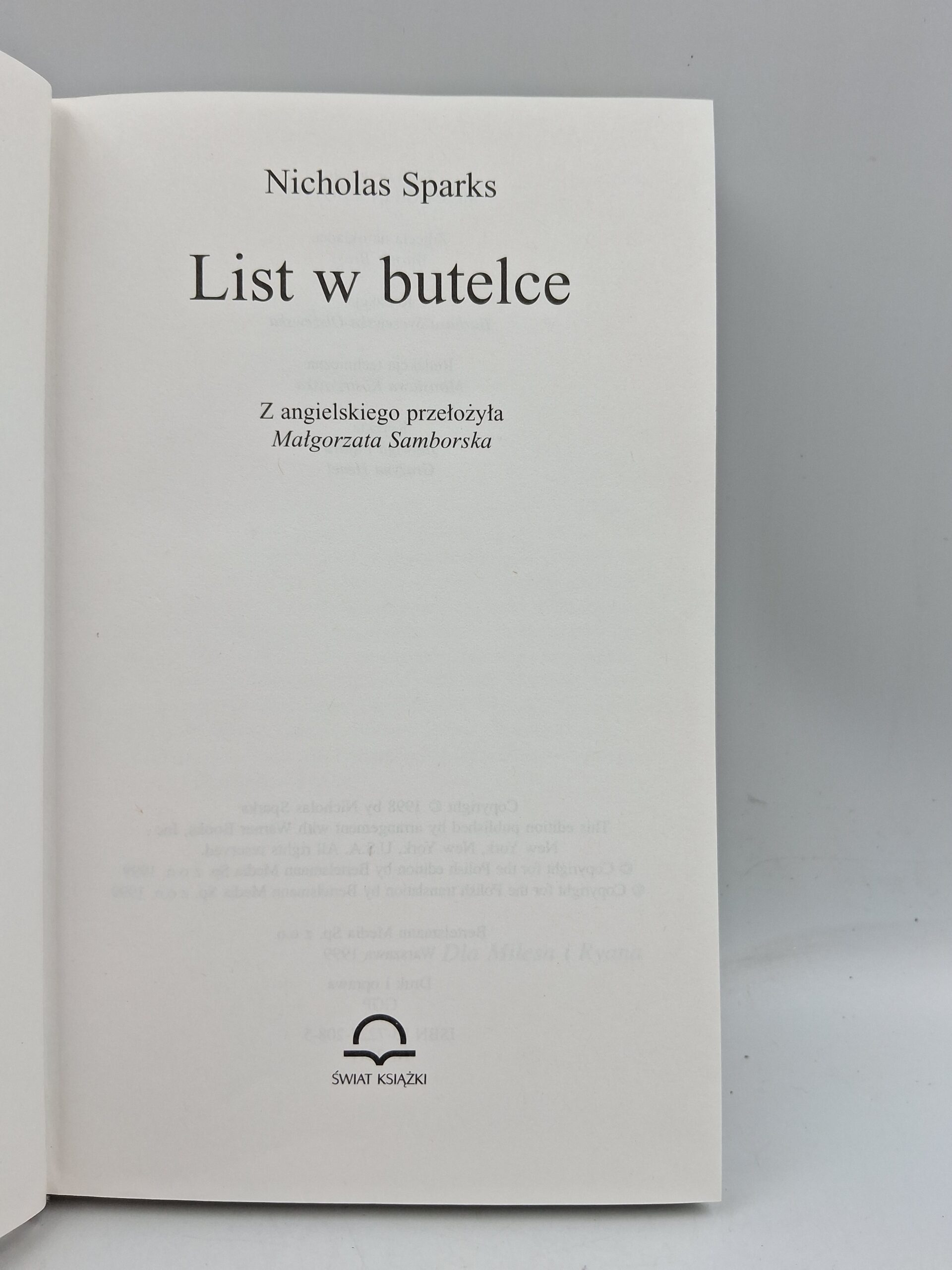 | Opis | Książka opowiada historię miłosną, która zaczyna się od znalezienia listu w butelce na plaży. Autorem listu jest mężczyzna, który stracił żonę, a jego słowa poruszają serce kobiety, która go znalazła. |