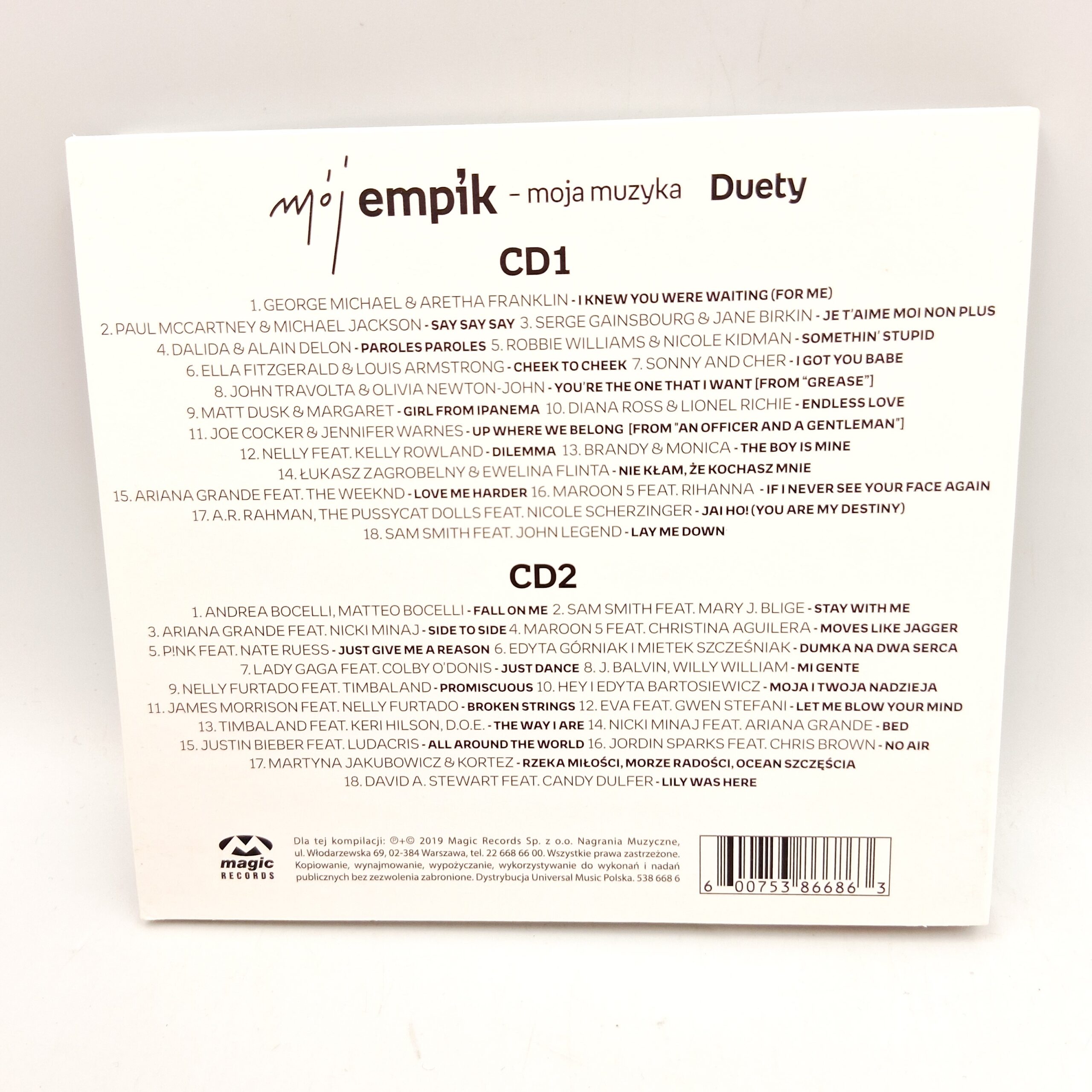 „Duety” z serii „mój empik – moja muzyka” to wyjątkowa kompilacja najpiękniejszych duetów w muzyce rozrywkowej. Na dwóch płytach znajdziemy utwory wykonane przez takie gwiazdy jak George Michael i Aretha Franklin, Robbie Williams i Nicole Kidman, a także Brandy & Monica. Album jest doskonałym wyborem dla tych, którzy cenią sobie emocjonujące wykonania i niezwykłe połączenia wokalne. Każda piosenka to podróż przez różnorodne style i epoki, co sprawia, że album jest nie tylko przyjemny dla ucha, ale i inspirujący.