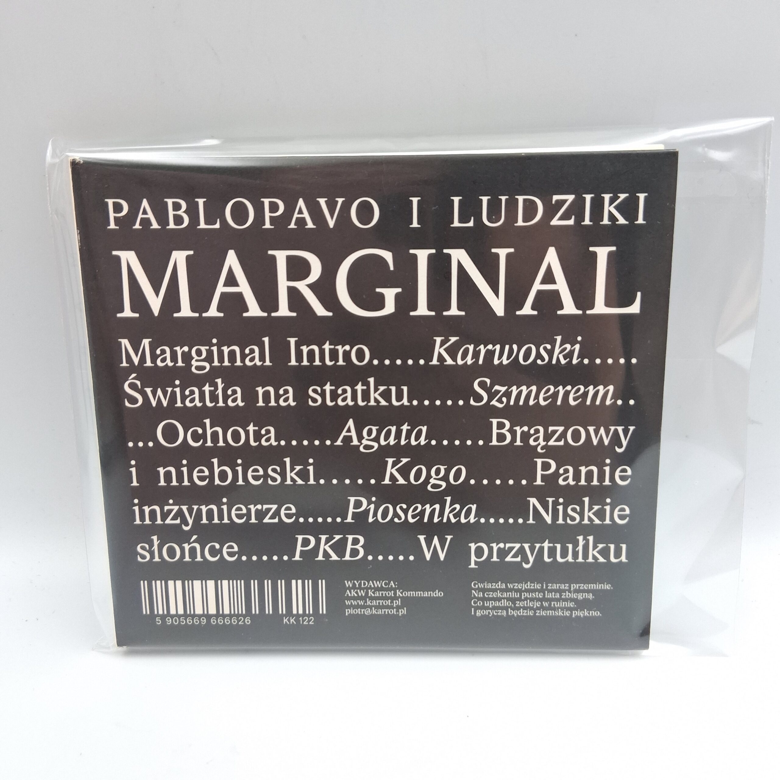 | Opis | Album muzyczny zespołu Pablopavo i Ludziki zawierający utwory takie jak 'Marginal Intro', 'Karwoski', 'Światła na statku', 'Szmerem', 'Ochota', 'Agata', 'Brązowy i niebieski', 'Kogo', 'Panie inżynierze', 'Piosenka', 'Niskie słońce', 'PKB', 'W przytulku'. |