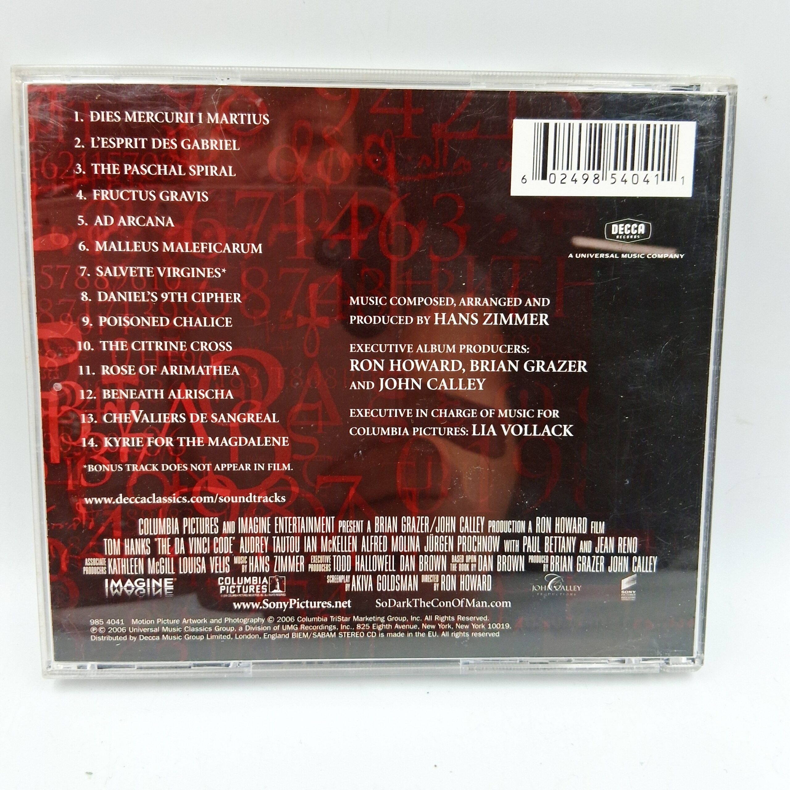Ścieżka dźwiękowa z filmu „The Da Vinci Code” została skomponowana przez Hansa Zimmera, znanego z tworzenia emocjonujących i nastrojowych kompozycji filmowych. Album ten doskonale oddaje tajemniczą atmosferę filmu, łącząc elementy muzyki orkiestrowej z mrocznymi, elektronicznymi brzmieniami. Kompozycje Zimmera przyciągają słuchacza swoją głębią i intensywnością, idealnie ilustrując klimatyczną podróż po tajemnicach historii. Ten album to prawdziwa gratka dla miłośników muzyki filmowej oraz fanów opowieści pełnych intryg.