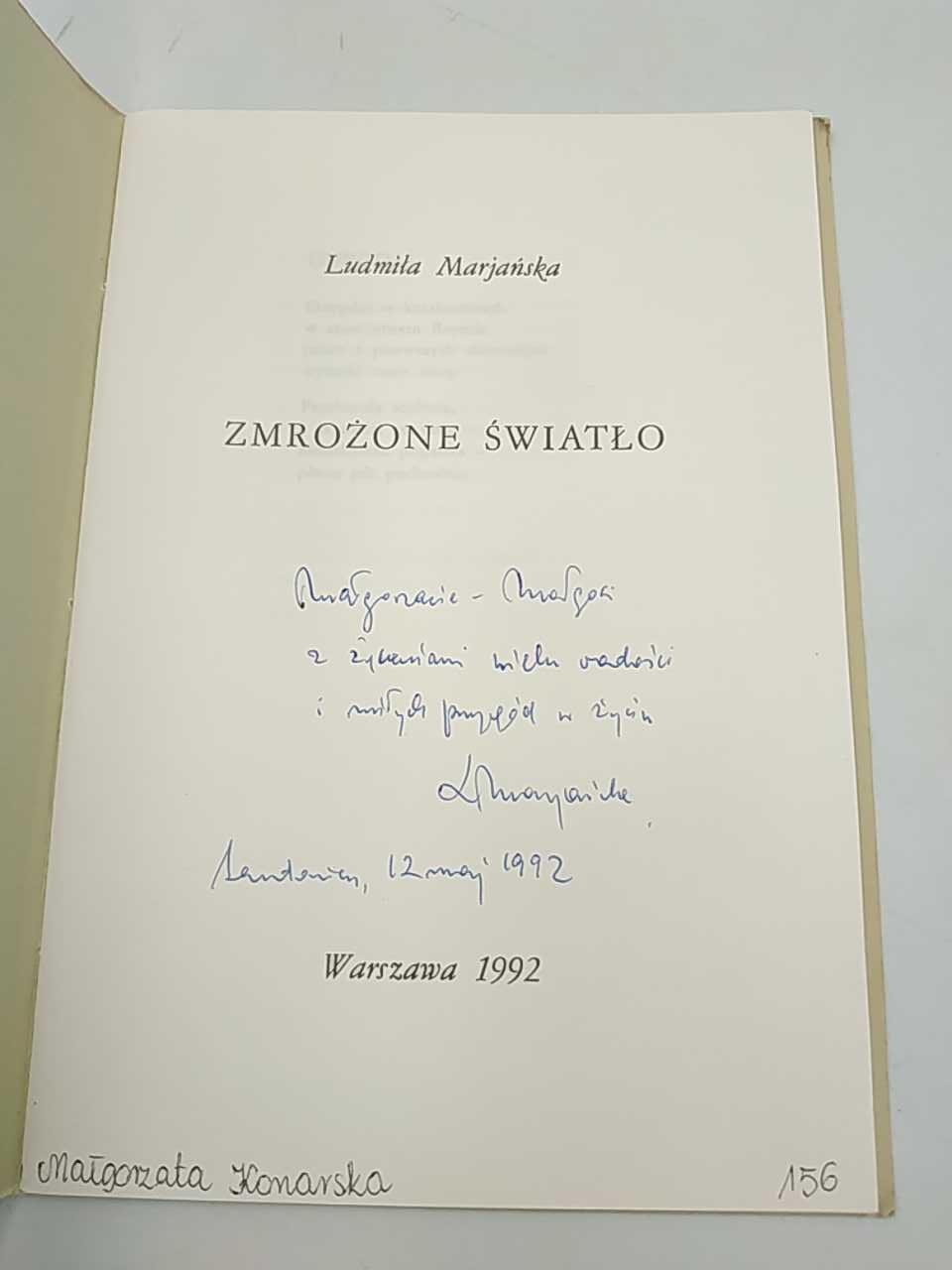 Ta książka „Zmrożone światło” autorstwa Marjańskiej to piękna okazja dla miłośników literatury z lat 90. Stan okładki jest lekko przybrudzony, jednak sama zawartość wewnętrzna jest w doskonałym stanie. Książka liczy 52 strony i zawiera dedykację na pierwszej stronie, dodając osobisty akcent do tego egzemplarza. Wydane w 1992 roku, to dzieło literackie z pewnością przyciągnie uwagę czytelników poszukujących unikatowych książek z historii literatury polskiej.